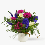 Contine: 1 Vas, 1 Verdeata verde Salal, 5 Frezii albe, 4 Zambile mov, 5 Minigerbera roz, 1 Veronica roz