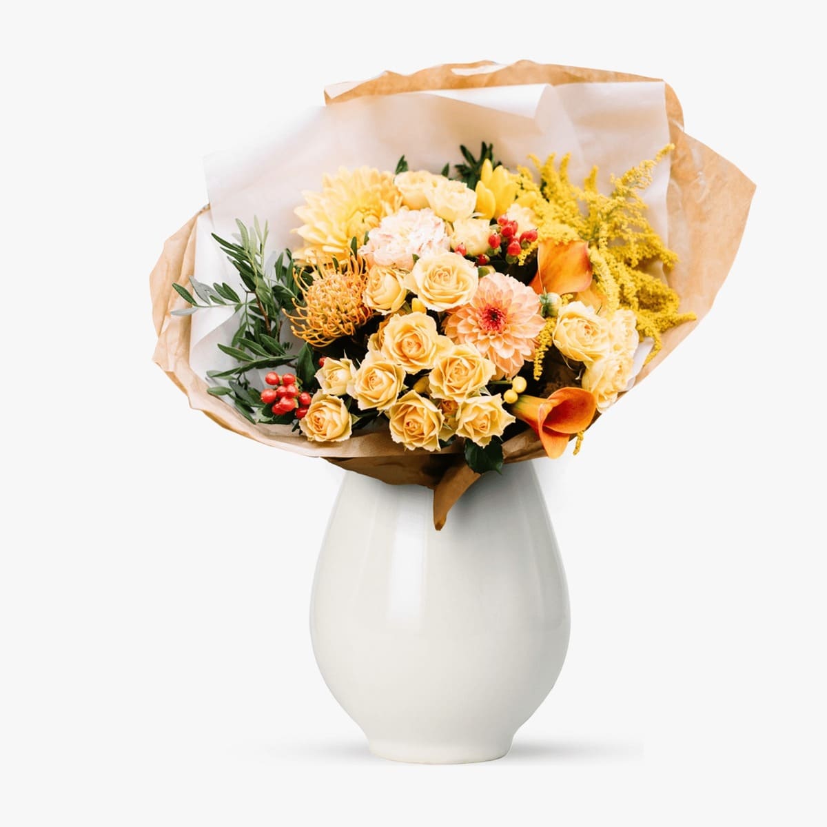 Acest buchet aduce stil și confort vizual, fiind o alegere apreciată de femeile Fecioară. Hortensia albă domină compoziția, oferind note de delicatețe, iar lavanda parfumează subtil aranjamentul. Combinația de trandafiri coffee break și accente de hipericum roșu adaugă culoare, totul fiind îmbinat cu verdeață proaspătă.