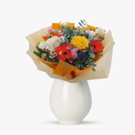 Ce cadou poate fi mai potrivit de Florii decat un buchet de flori special? Daca vrei sa-i faci o surpriza, in Duminica Floriilor, trimite-i aceste flori colorate si proaspete, ca o zi frumoasa de primavara! Buchetul de flori contine: trandafiri galbeni, zambile mov, lalele roz, lisianthus alb, mini gerbera portocalii, wax flower, verdeata.