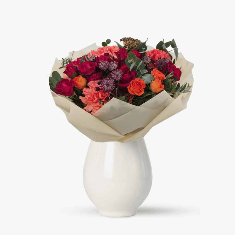 Cunosti pe cineva care are o adevarata pasiune pentru flori? Ofera-i in dar acest buchet! Combinatia cu trandafiri, minirosa, astrantia si garoafe este alegerea perfecta pentru cei dragi. Acest buchet elegant combina tonurile vibrante ale trandafirilor rosii si minirosa cu nuantele delicate ale garoafelor peach. Astrantia si verdeata adauga o nota de prospetime si echilibru. Fiecare element este selectat si aranjat cu atentie pentru a crea o compozitie florala de neuitat.